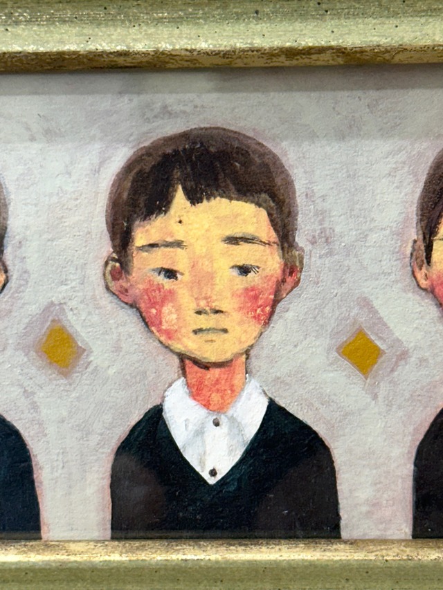 廣田美乃制作の小さな作品。acrylic, pencil on paper. 額サイズ:16x13.5cm 男の子の肖像。 他、作品 post card (¥110/一枚)セットと廣田美乃作品集 Favorite Art view BOOK(A5版、40ページ ¥800/一冊)をプレゼント ギャラリーモーニング京都にて個展を開催するアーティスト 過去の展覧会模様はこちらから https://gallerymorningkyoto.blogspot.com/2025/10/hirota-yoshino-exhibition-2025-1114-tue.html ※最後の写真は展示風景